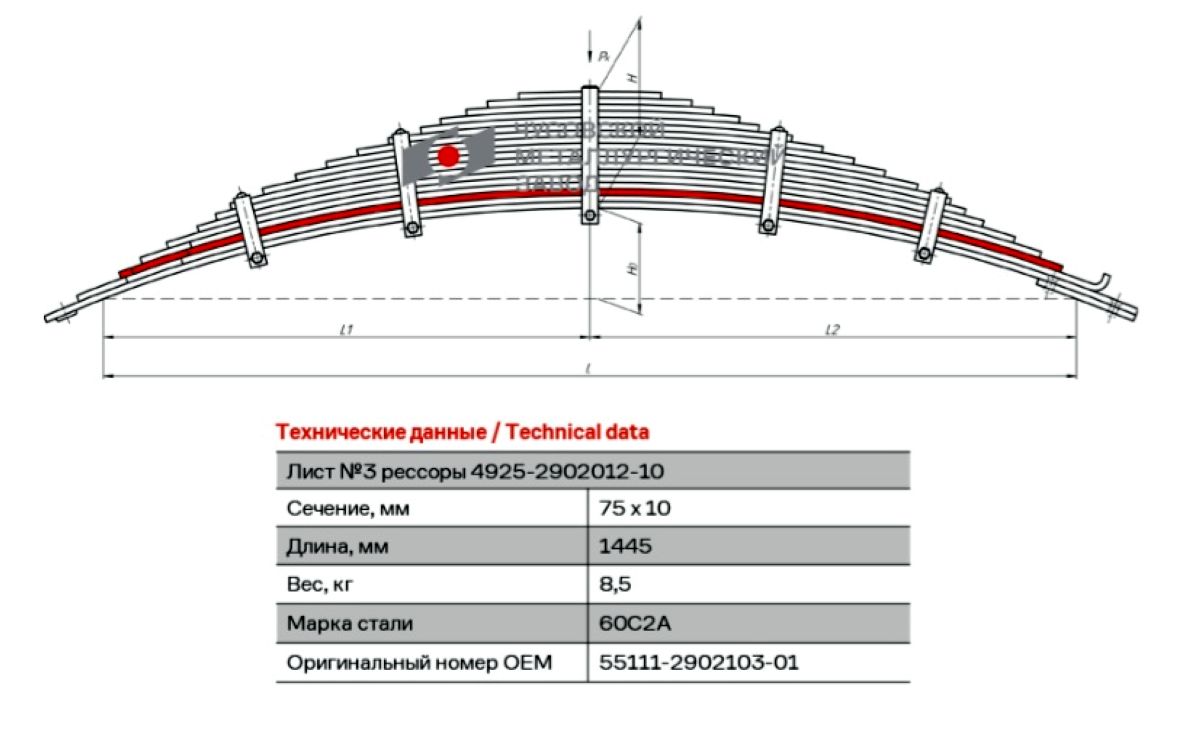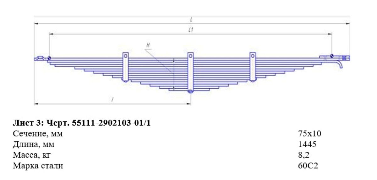 Лист КАМАЗ 3 передний L=1445x75x10 55111-2902103