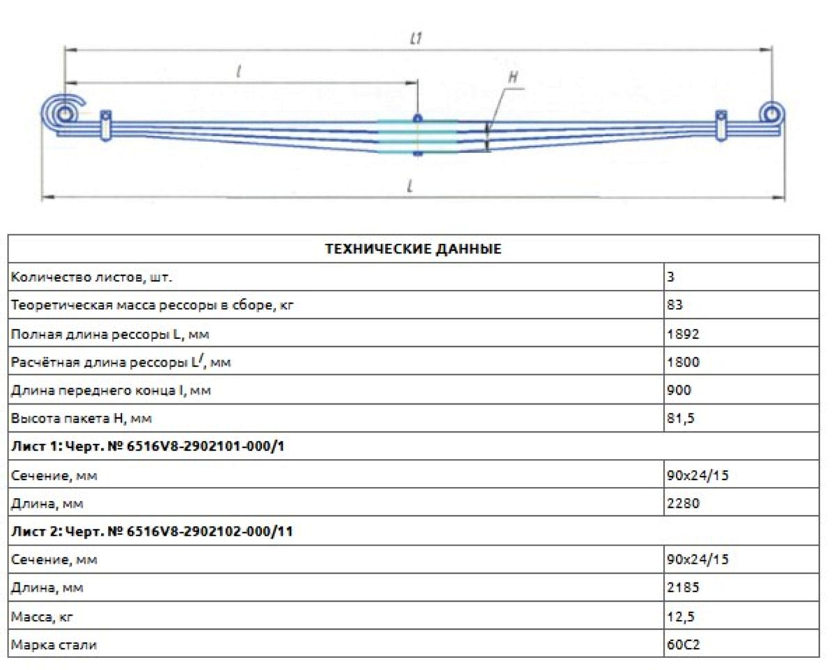 Рессора МАЗ передняя L-1890мм 3-х лист. 2 витых ушка 6516V8-2902012-000/1